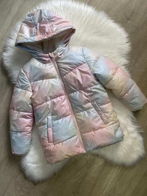 Ніжна, перламутрова куртка для дівчинки George, єврозима/демісезон, хутряна підкладка та наповнювач, стан в цілому ідеальний, лише на рукавах є нюанси (трішки злізло покриття матеріалу) вік 5-6 років Заміри: Довжина - 55 Плечі - 33 Рукав - 43 Півобхват - 40
