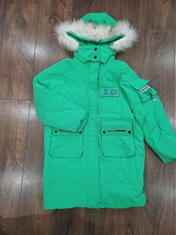 куртка на дівчинку, на зріст 150см. Еко мех. Водоніпроникна тканина. На рукавах манжети. Длина 80см. рукав реглант, длина від горловини 66см. Потрібує невиликої хімчистки