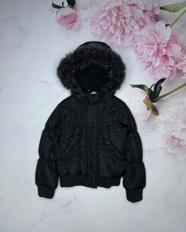 Классная,стильная куртка-бомбер для девочки. сезон хол. осень весна. состояние отличное. черная в звездочки,капюшон тёплый,мех отличный,хорошо переносит стирку и легко расчёсывается. Манжеты впорядке. 5-6 л George длина 41. подрук 36. рукав 43