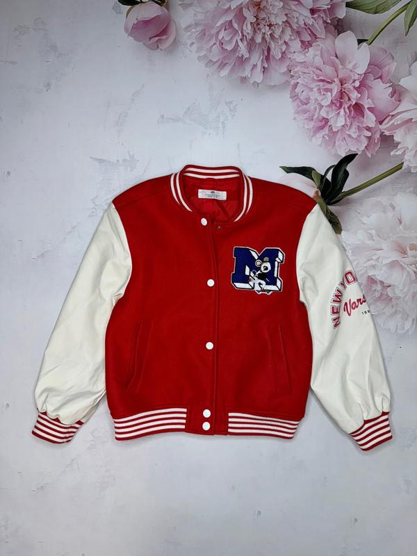 Куртка бомбер с рукавами из экокожи Застегивается на кнопки, подкладка полиестер, карманы. Эластичные манжеты на рукавах. Состояние идеальное 🏷️H&M 8-10 лет/134-140 Длина 51. ПОГ 45. Рукав 49-60