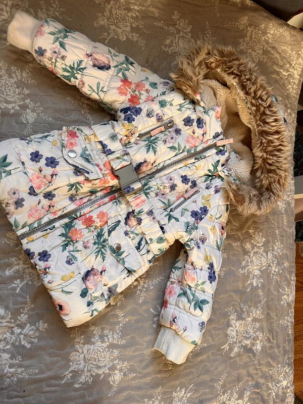 Наша улюблена мила курточка на дівчинку 9-12 місяців. Стан добрий. На манжетах не значні катишки, які легко прибрати. Капюшон трішки відпоровся на шві, якщо встигну пришию. Єдине, на поясі пластмасова защолка тріснула, можна замінити, або взагалі без поясочка одягати.