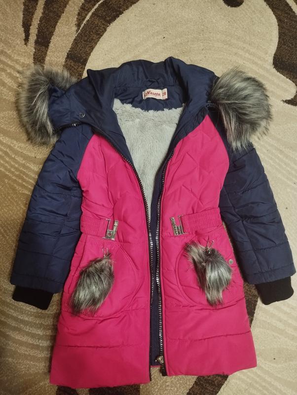 Ця куртка є яскравою та стильною зимовою моделлю. Вона має рожево-синє забарвлення, де основна частина є рожевою, а рукава та капюшон – сині. Куртка оснащена капюшоном із хутряними вставками сірого кольору на краях, що додає їй затишку та елегантності. На кишенях є декоративні елементи з пухнастого сірого хутра, що робить її більш привабливою. Усередині куртка утеплена м'яким світло-сірим підкладом, що забезпечує додатковий комфорт і тепло. Застібка представлена центральною блискавкою, а також є декоративні пряжки на талії для акцентування силуету. На вік 8-10 років.