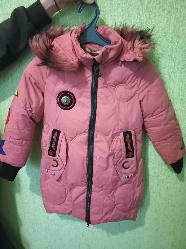 Куртка зимова, дитяча, стильна, рожевого кольору, на теплій підкладці, з карманами, капішон знімається! На 8-10 років, 128 розмір. Довжина - 74см., перед коротший на 5 см Довжина рукава - 49см Ширина плечей -33см Ширина грудей- 43см,. Ширина бедер - 48см.