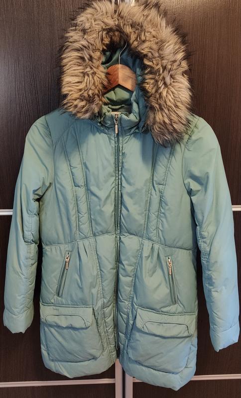 * Куртка детская для девушек демисезонная, средней длины, примерно до середины бедра. * Цвет куртки – бирюзовый (приглушенный зеленый), напоминающий цвет морской волны или мяты. * Материал верха – стеганая ткань с водоотталкивающей пропиткой. * Стежка выполнена горизонтальными линиями, создающими визуальный эффект пуховика. * Куртка имеет капюшон, отделанный искусственным мехом, что придает ей теплый и уютный вид. * Мех на капюшоне отстегивается, что удобно для ухода за изделием. * Застежка – центральная молния по всей длине куртки, обеспечивающая надежную защиту от ветра и холода. * Куртка имеет четыре кармана: два верхних на молнии и два нижних накладных с клапанами. * Верхние карманы расположены под углом, что добавляет динамичности дизайну. * Нижние карманы достаточно вместительны и удобны для хранения мелких вещей. * Крой куртки – прямой или слегка приталенный, подчеркивающий женский силуэт. * Рукава – втачные, на резинке, что обеспечивает дополнительное тепло. * Куртка выглядит легкой и комфортной в носке, не сковывает движений. * Общий стиль куртки – casual или городской, подойдет для повседневного использования. * Куртка выглядит практичной и функциональной, идеальной для холодного времени года. * Куртка красиво носится в не сильный мороз и влажным сезонам благодаря технологии respira.