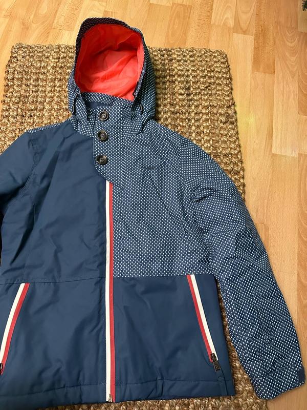 Куртка Protest Robena (модель із лейблом “Protest Boardwear”), абсолютно нова з усіма бірками. Розмір - 152 Заміри: Ширина по плечам (по швам) - 38 см. Ширина по грудям (під пахвами) - 48 см. Ширина по низу - 47.5 см (регулюється). Довжина рукава від плеча - 58.5 см. Висота (від шва капюшона до низу) - 58 см. Це жіноча (на дівчинку) зимова або демісезонна куртка, що має яскравий дизайн: 1. Дизайн: • Поєднання темно-синього кольору з контрастним узором у дрібний горошок на правій стороні та капюшоні. • Присутні декоративні червоно-білі блискавки на кишенях та по центру. • Червона внутрішня підкладка додає контрасту. 2. Функціональність: • Вказано технологію Geotech з водонепроникністю 5000 мм (захист від дощу й снігу). • Дихаючі властивості також на рівні 5000 г/м²/24 години, що забезпечує комфорт при активному використанні. • Присутній капюшон для додаткового захисту від негоди. 3. Матеріал: • Використано водостійкі та вітрозахисні тканини для забезпечення теплозахисту й зручності у холодну погоду. Куртка виглядає стильно й функціонально, підходячи для зимових видів спорту чи повсякденного використання в прохолодну погоду. Нова.