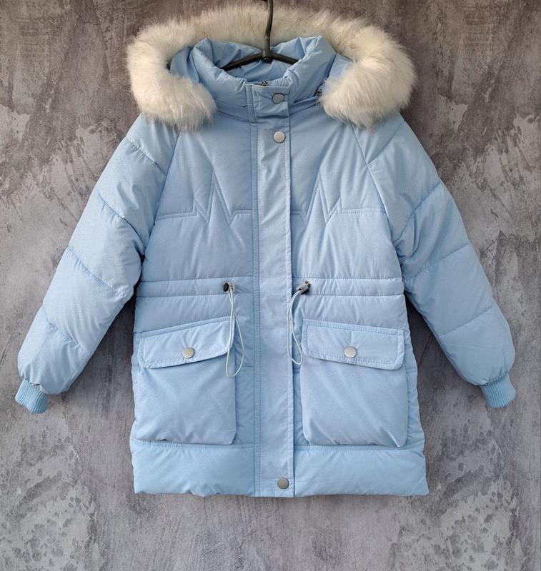 !!!Не оформлюйте будь ласка замовлення, не уточнивши наявність Красива зимова куртка для дівчаток виконана з водовідштовхувальної плащової тканини. Модель прямого крою, застібається на блискавку, зверху планкою на кнопках, в області талії регулюється резинкою на фіксаторах. Рукав-реглан, низ рукава на еластичному трикотажному манжеті. Капюшон із штучним хутром, є накладні бічні кишені, закриваються клапаном із кнопкою. Підкладковий матеріал: під штучне хутро, в рукавах - тканина (поліестер) Утеплювач: синтепон (щільність орієнтовно 180 г/м²) Країна-виробник: фабричний Китай Колір: ніжно-блакитний (наживо відтінок може незначно відрізнятися) Капюшон: знімний, хутро на капюшоні - вшите Сезонність: єврозима Розміри по біркам S, XL (орієнтовно на зріст 128/134, 146/152, залежно від комплекції дитини). Щоб уникнути неправильно підібраного розміру дивіться та орієнтуйтесь на заміри, заміри вказані по готовому виробу, допускається похибка у вимірах +/-1-2см !!! Рекомендую порівнювати заміри ВЕРХНЬОГО ЗИМОВОГО ОДЯГУ такого плану з моїми замірами (виріб кладу на рівну поверхню, розрівнюю руками, щоб не було складок, потім роблю заміри). !На моделі р.S (параметри моделі: зріст 134, обхват грудей 60см, обхват талії 50см, обхват стегон 70см) -S п/о грудей 43см, п/о талії 44см, п/о стегон 46см, довжина рукава з плечем та манжетом 58см, довжина по спині 62см -XL п/о грудей 48,5см, п/о талії 49,5см, п/о стегон 51,5см, довжина рукава з плечем та манжетом 65см, довжина по спині 70см Заміри та фото, крім тих, що на моделі мої особисто. На всі запитання відповім у повідомленні.