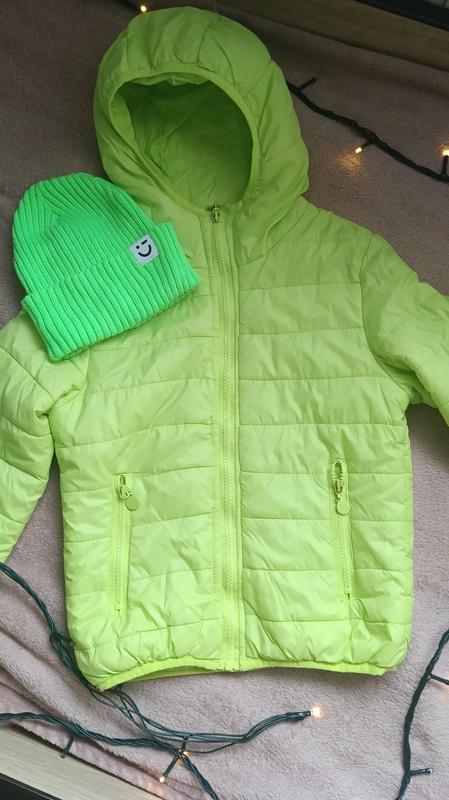 Легка курточка на весну, яскравого салатового кольору, шапочка в комплекті.