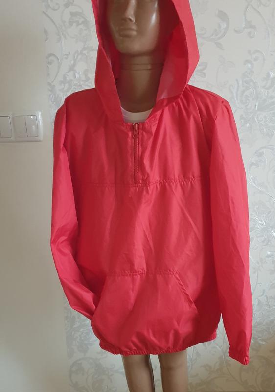 ветровка для девочки с капишоном возраст 11 лет цвет красный на рукавах и по низу изделия резинки длина изделия 63 см длина рукава 56 см о/г 94 см материал плащевка производитель Китай