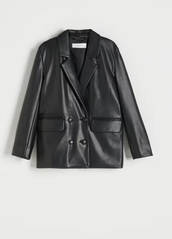 комір з V-подібними лацканами двобортна застібка на ґудзики довгі рукави дві кишені з клапанами спереду гладка підкладка