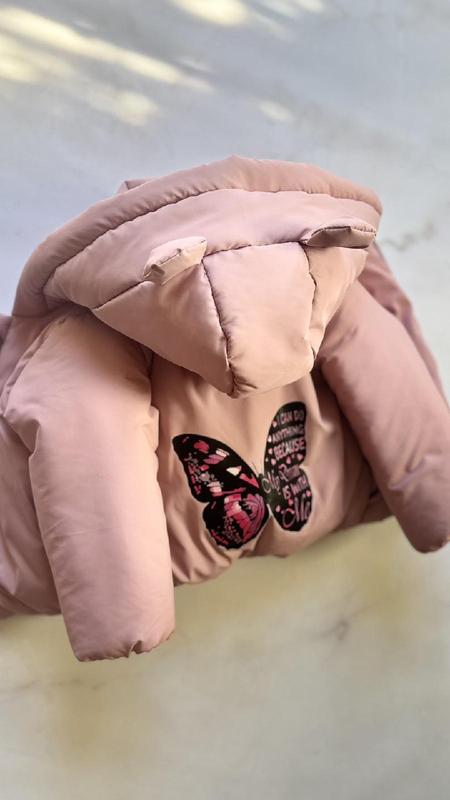 Курточка "Вutterfly"" Розмір: 8**********,110 Склад: Курточка виготовлений з високоякісного матеріалу, який забезпечує надійний захист від вітру та вологи. Внутрішня підкладка з гладенького нейлону забезпечує комфорт та легкість під час носіння. Синтепонова підкладка товщиною 150 г/м² колір : пудра Особливості: -Капюшон із вушками -Зручні манжети на гумці для додаткового комфорту. -Низ жакета також виконаний на гумці, забезпечуючи ідеальну посадку та зберігаючи тепло. -Водонепроникна та вітростійка плащівка Арт ар