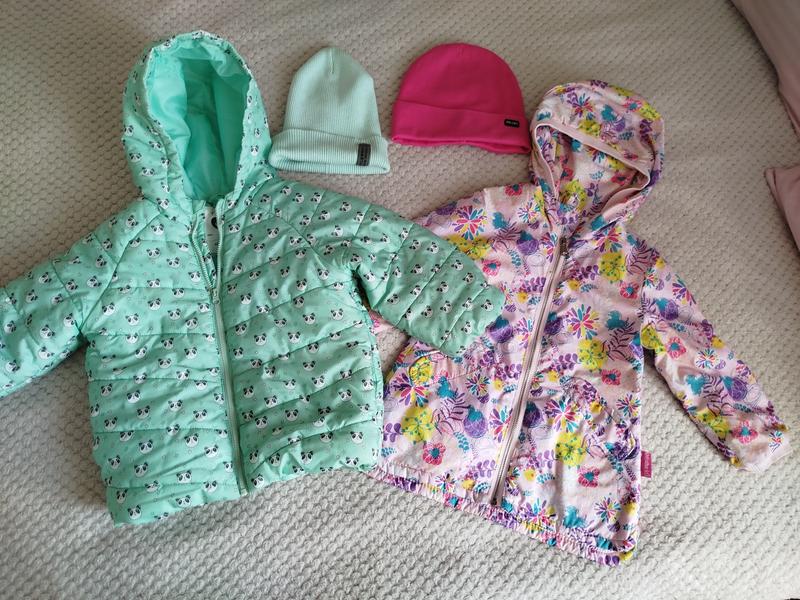 Продам одним лотом.Курточки для дівчаток,рожева вітровка,а зелена утеплена на підкладці і шапочки до них