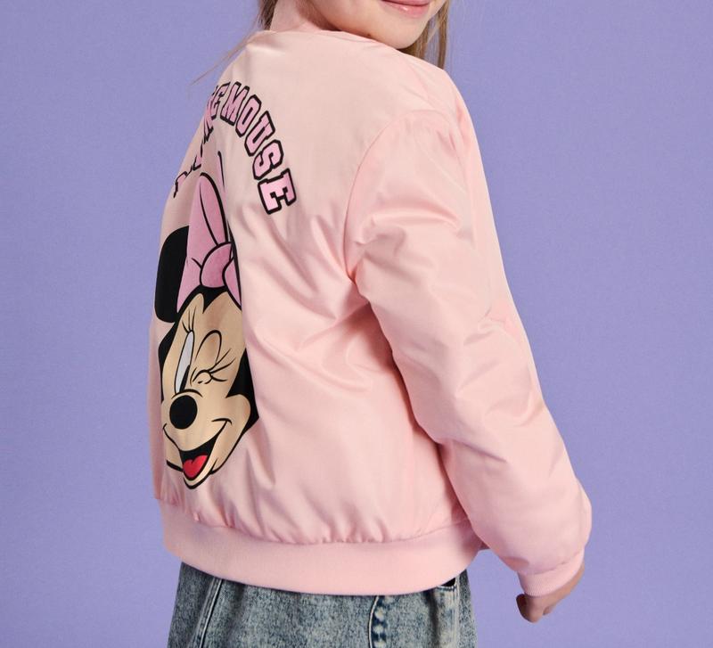 Фірмова куртка-бомбер Mіннi Маус. Дуже гарна, приємний пастельно-рожевий колір, рукава з манжетами в рубчик, дві передні кишені, принт спереду і ззаду. Матеріал: 100% поліестер. Розміри: 104-140