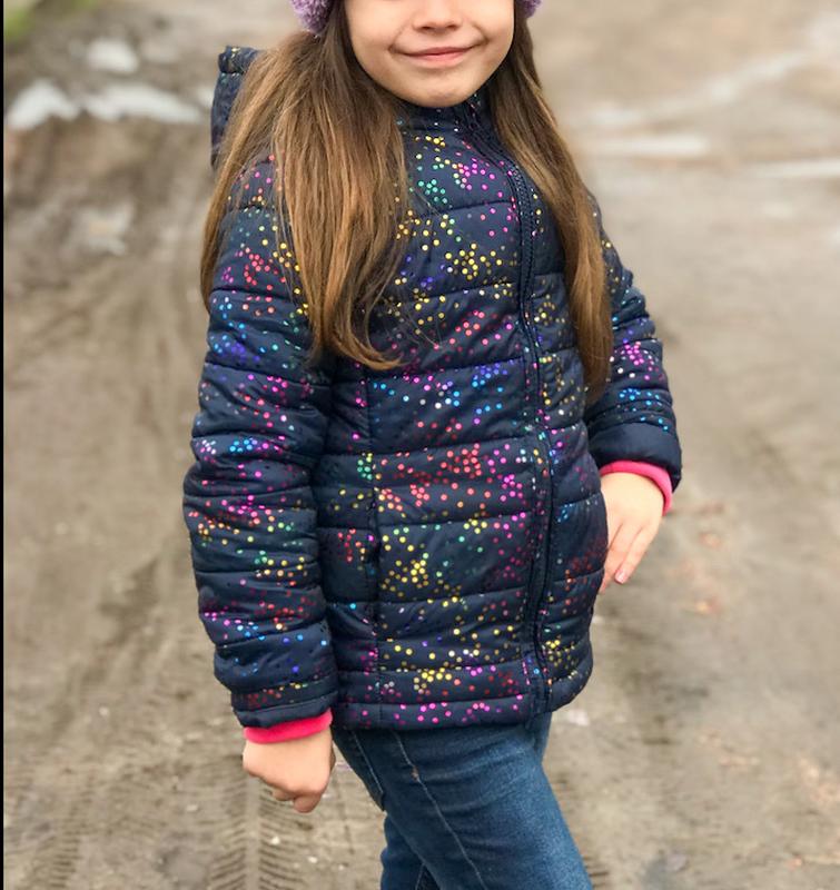 Практична демисезонна куртка для дівчинки. Зверху вологостійкий і вітронепродувний матеріал. Наповнювач - силікон. Всередині - гладка поліестерова підкладка. З капюшоном, всередині з поліестеровою підкладкою. Спереду застібка - блискавка, із захистом шиї при закриванні. Довжина 44 см Довжина рукава 47 см Ширина 36 Дві кишені спереду. Прикрашена принтом. Сезонність: весна, тепла осінь. Склад: 100% поліестер.