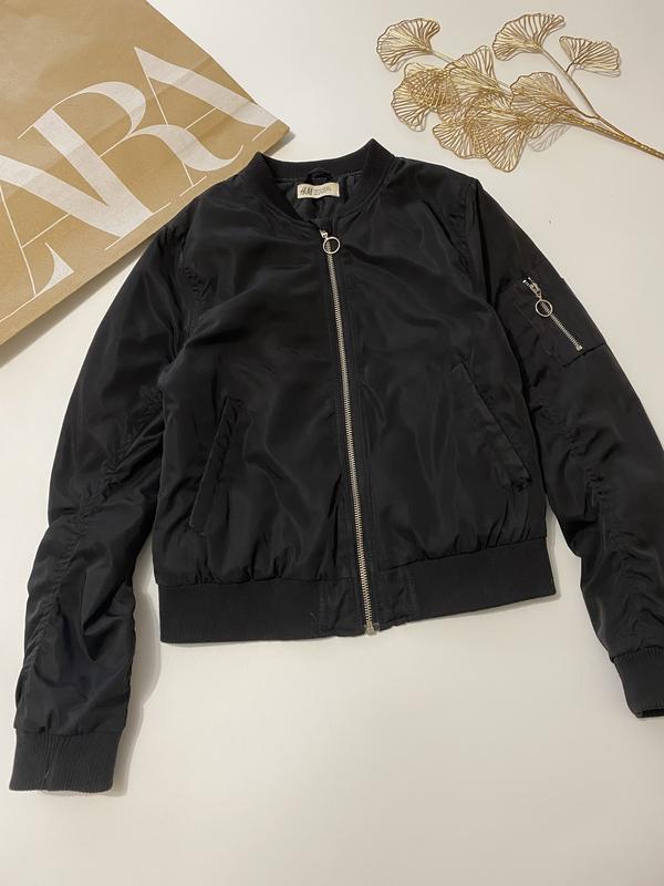 Куртка бомбер на тоненькому утеплювачі Розмір вказаний на 10-11 років Плечі 36, пог 45, довжина 51, рукав 58 Єнюанс в районі кармана розійшовся шов, можна усунути вручну, вказано на фото