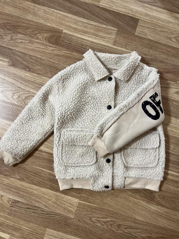Дитяча куртка кремового кольору з м'якого хутряного матеріалу. Має дві накладні кишені спереду, кнопкову застібку і комірець. На спинкі декорований принтом. Ідеально підходить для прохолодної погоди. Розмір:110-116 Ціна: 500 грн