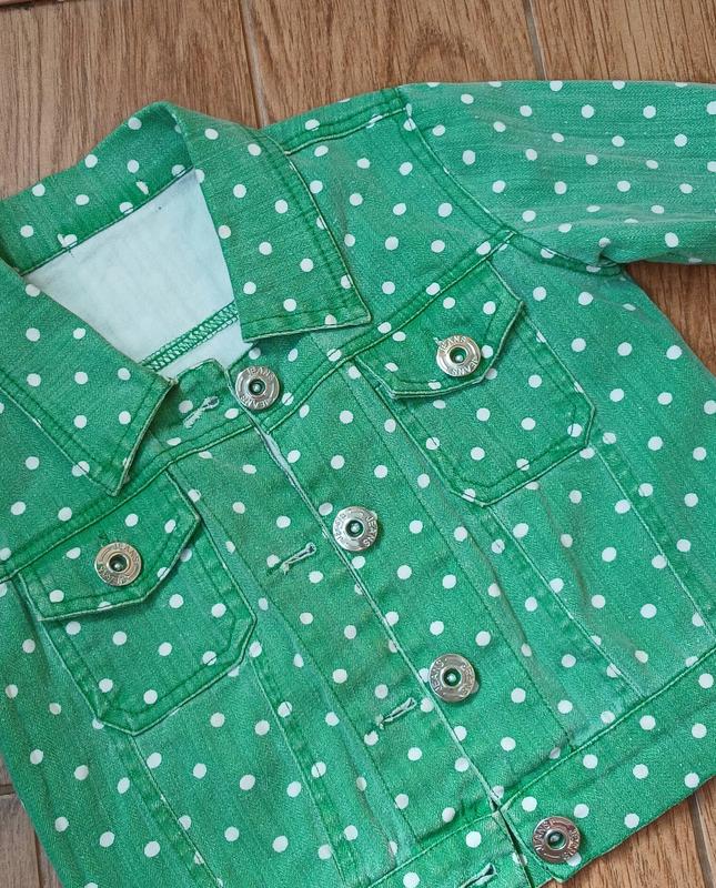 Зеленая джинсовая куртка в горошек на возраст 3-4 года застегивается на шудзики имеет 2 кармана Ширина -32см Длина- 34см Рукав- 33см Продаю все по приятной цене. Смотрите мое другое объявления, так выгодно брать несколько вещей. Пересылаю Укр., Новой, Mest по почте, после оплаты, или из-за безопасного оплата на шкафу Н