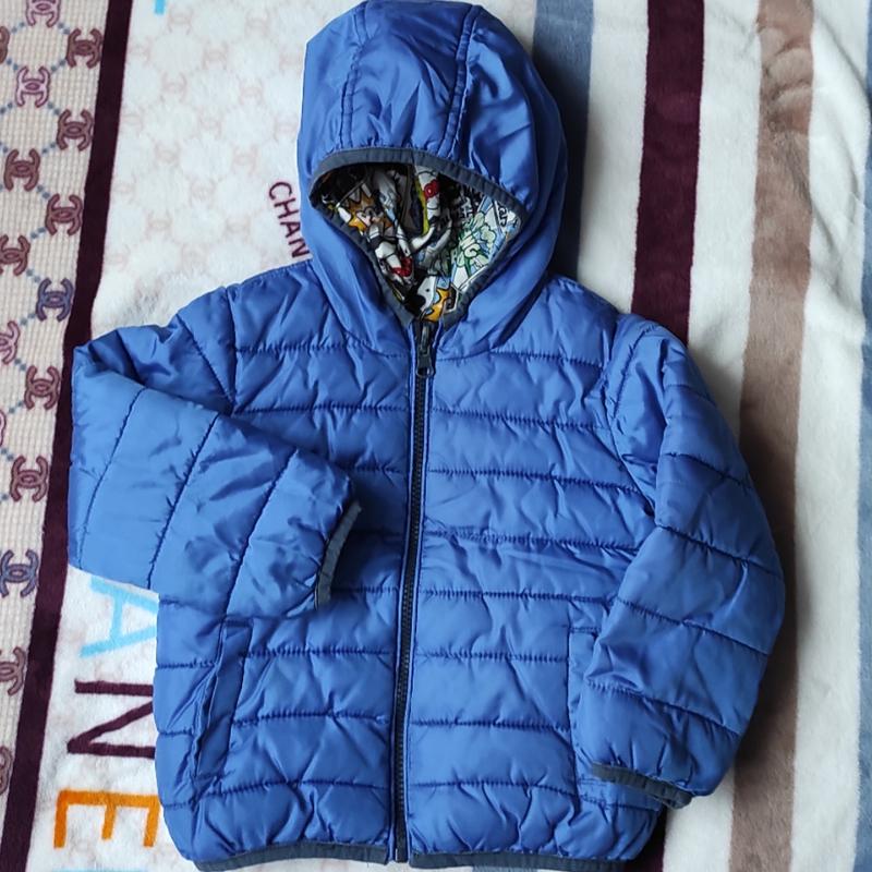 Демі курточка на 3-4 роки. носили більше на синю сторону. колір яскравіший. резинка на рукавах і по капішону трохи вигоріла. на синій стороні є трошки затяжки, якщо добре придивитися.