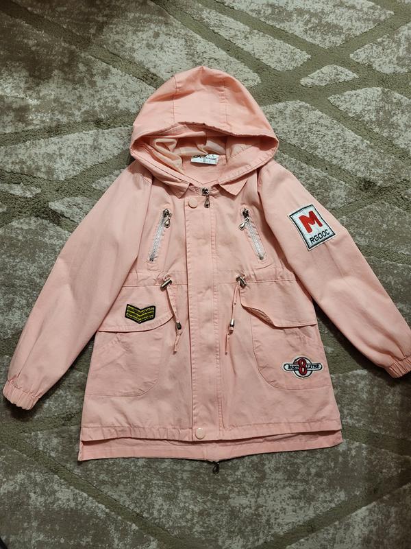 Легенька курточка вітровка, в ідеальному стані. 100% плотний котон. Розмір 134. Заміри: довжина - 52-55 см, ширина під рукавами - 37 см, плечі - 30 см, рукав 45 см.