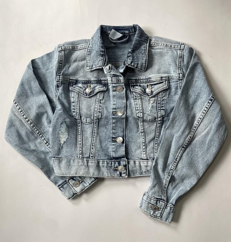 Джинсова стильна куртка укорочена , сіро-блакитного кольору на дівчинку 10-11 років