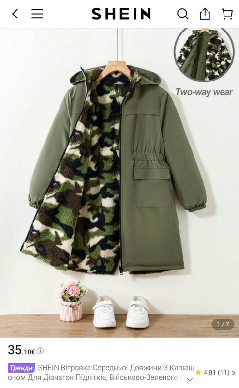 SHEIN Вітровка середньої довжини з капюшоном для дівчаток-підлітків, військово-зеленого кольору, однотонна та модна, камуфляжна, флісова, вільна, повсякденна, тепла, двостороння, з капюшоном, завужена до талії, універсальна. Довжина рукава 50 см Ширина по плечах 36 см Довжина по спині 77 см Обхват по талії 70 см Обхват грудей 85 см Два накладних кармани
