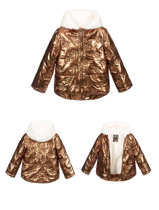 Нова курточка ikks (6 міс на ріст 68 см) Темно-золота куртка на блискавці для молодших дівчаток від IKKS. Виготовлена з водовідштовхувального нейлону з легким м'ятим виглядом, вона прикрашена ніжним візерунком з вишитими квітами. Має ребристі внутрішні манжети, надзвичайно м'який капюшон і підкладку зі штучного хутра кольору слонової кістки. Стильна та тепла, підкладка цієї куртки виготовлена з переробленого поліестеру.
