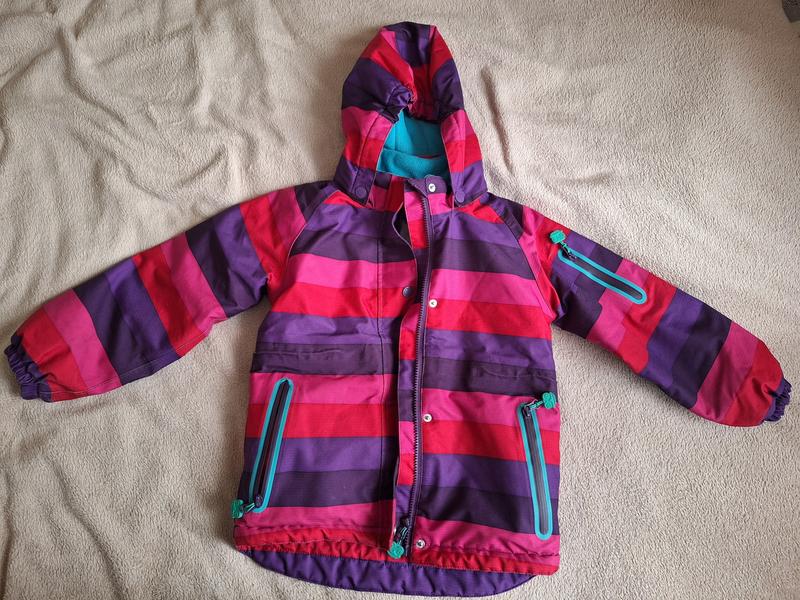 Термокуртка на холодну осінь для дівчинки зі знімним капюшоном. Має світловідбивний елемент у вигляді жабки. Якість тканини топ, має лише потертості на ярлику і замках які показані на фото.