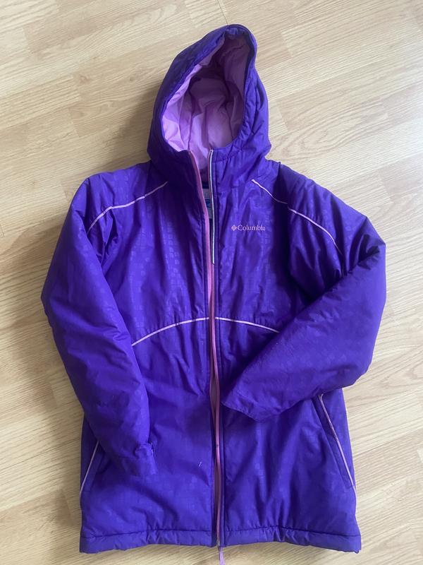 Дитяча куртка Columbia фіолетового кольору з довгим кроєм. Ширина плечей 36 см, довжина від капюшона 63 см, довжина рукава від плеча 54 см. Стан дуже гарний.