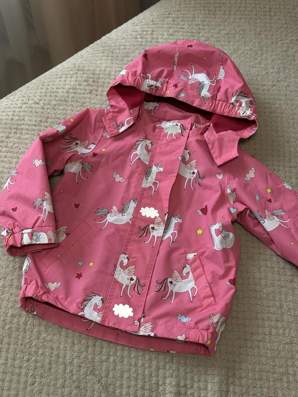 Милая ветровка для девочки Водоотталкивающая. Имеет светоотражатели. Капюшон отстёгивается Состояние отличное, слегка пару потертостей на рукавах (последнее фото) Длина 42/45 Ширина 37 Рукав 37 Плечи 28