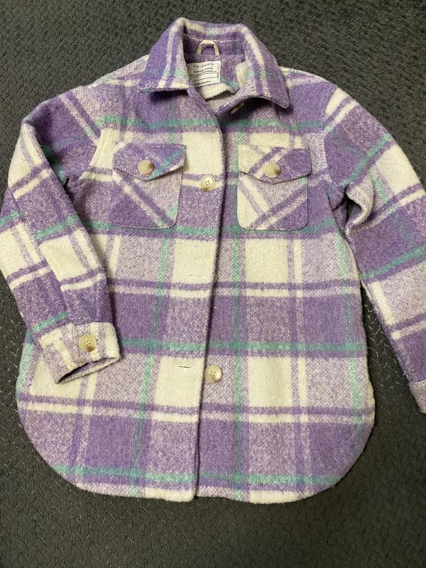 Гарна дитяча рубашка в білофіолетовий квадратик,на 9-10 років,півобʼєм грудей 46,довжина рукава 47-48,довжина рубашки 63