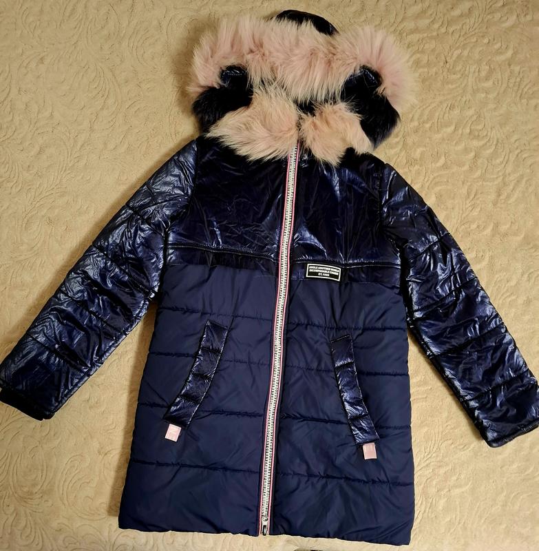 Куртка для девочки в насыщенном синем цвете с оригинальным оформлением цветовой гаммы. Воротничок из отстегивающегося искусственного меха. Перчатки с манжетом. Очень удобная и теплая. Идеальное состояние.