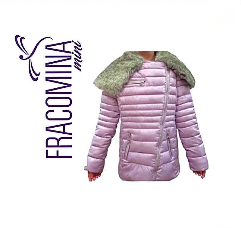 Куртка єврозима для дівчинки відомого італійського бренду Fracomina . Куртка стьобана і виготовлена з блискучої тканини бузкового кольору. Особливістю моделі є коса блискавка на всю довжину спереду і великий комір зі штучного,мʼякого,приємного на дотик хутра. Спереду на куртці є дві бічні функціональні кишені з блискавками і одна зверху горизонтальна.Декоративні блискавки є також внизу на рукавах.Вся фурнітура виконана з « срібла». Куртка тепла,з наповнювачем ізософт. Модель ідеальна для дівчаток 13-14 років.