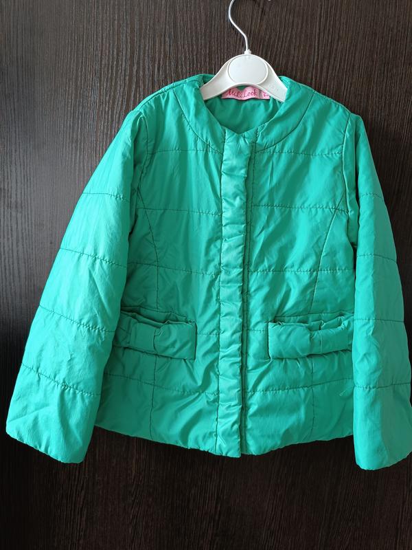 Куртка Mililook 92р. на дівчинку. Зеленого кольору. Гарна на весну. Має дві кишені з бантиками в колір куртки. Застібка на кнопках. Без коміру. Довжина 41 см Півобхват грудей 30 см Довжина рукава від плеча 39 см