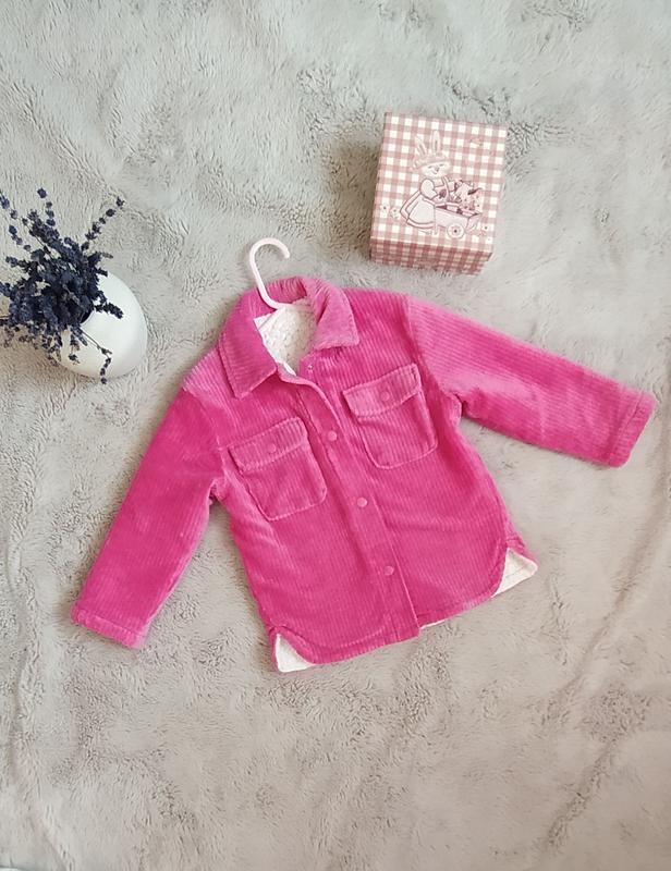 В кольорі барбі куртка сорочка для дівчинки 4-5 років, внутрі меховушка Це дитяча вельветова куртка-сорочка яскравого рожевого кольору. Виготовлена з м'якого вельвету (рубчика),зі 100% бавовни. Має вільний, оверсайз крій , що ідеально підходить для створення багатошарових образів, наприклад, її можна одягати поверх футболки з довгим рукавом.