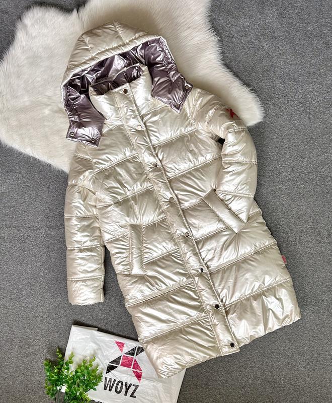 Пухова подовжена куртка для дівчинки відомого українського бренду X-Woyz. Якісна, стильна, тепла. Розмір 38, на зріст 140-146, але якщо дівчинка худенька, то буде і до 152 см. Наповнювач - еко пух, витримує холод до -25. Капюшон на блискавці, з фіксацією на шнур і широким коміром на кнопках. Класно захищає від вітру та холоду. Дві кишені бокові на кнопках і одна внутрішня на блискавці. Застібка на блискавку та кнопки, низ регулюється куліскою. Дуже гарний колір - «перлина», як на останньому фото, вдягнена на зріст 146 см. Є маленький нюанс (передостанні фото) - ззаду внизу та біля правого рукава є малопомітні зачіпки. В іншому стан відмінний. Наповнювач не збитий. Носили один сезон і то рідко, бо зима була тепла. Плечі - 37 см Напівобхват грудей - 48 см Рукав - 58, внут.шов 44 см Довжина 89 см. Доставка Укрпоштою і Новою. Є Безпечна оплата.