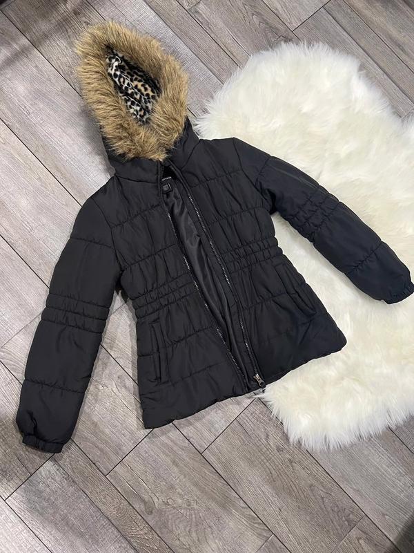 Чорна куртка для дівчинки на синтепоні. З капюшоном, капюшоном тигровий на флісі та з хутром. Флісі шапочка з вушками в комплекті