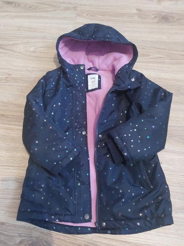 Демисезонна куртка для дівчинки утеплена флісовою підкладкою в хорошому стані( подертостей і плям немає). Розмір на ріст 128см, не маломірить. З дефектів є невеличкі потертості на замку і кнопках( все видно на фото).