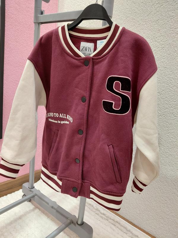 куртка-бомбер ZARA має бордовий основний корпус, білі рукави та написи. На лівій стороні грудей розташований текст "BE KIND TO ALL KIND kindness is golden", а на правій — велика літера "S".