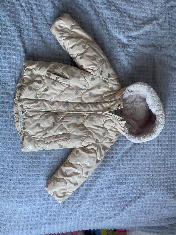 Зимова тепла курточка на дівчинку віком 3-4 роки. В хорошому стані, можливо десь потерті сердечка,але не замітно. При потребі надам розміри. З капюшоном.