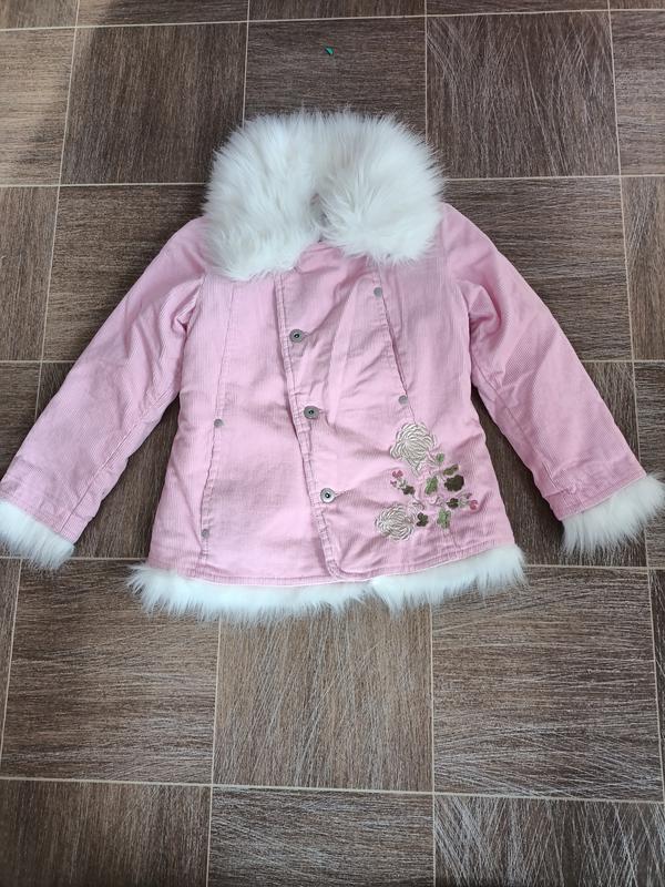 Куртка новая, но без бумажной бирки. На рост 116 см. Утепление синтепон. Мех искусственный снимается все,на воротнике, рукавах и низ. Ткань ольвет (коттон) ПОГ 40см Длина без меха 48см З хутром 53см Плечи 32см Длина рукава 43см/47см.