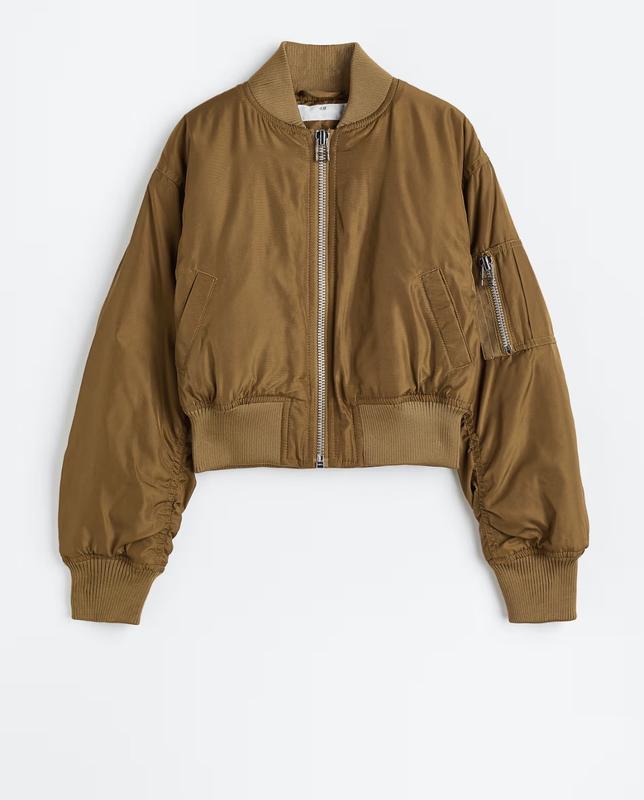 Укорочена куртка-бомбер . З застібкою-блискавкою спереду з захистом підборіддя від натирання та спущеними плечима. Зібрані шви на рукавах та кишеня на блискавці. Прорізні передні кишені та широка ребриста обробка навколо манжетів та подолу. На підкладці.