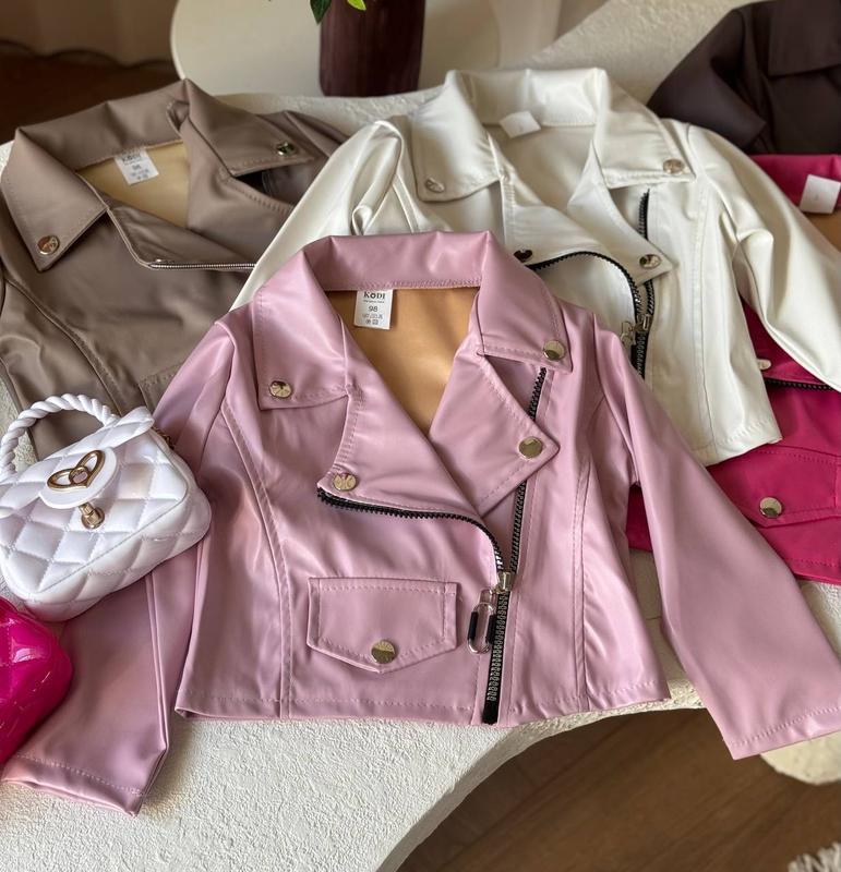 Без підкладки. Сезон тепла весна. Мʼягенька еко-шкіра. Якісна фурнітура. Трішки укорочена модель. Заміри: 98-довжина 31, ширина 30, рукав 33. 104-довжина 33, ширина 31, рукав 36. 110-довжина 35, ширина 33, рукав 37. 116-довжина 37, ширина 33, рукав 39. 122-довжина 38, ширина 34, рукав 41. 128-довжина 41, ширина 35, рукав 44. Замір рукава від плеча.
