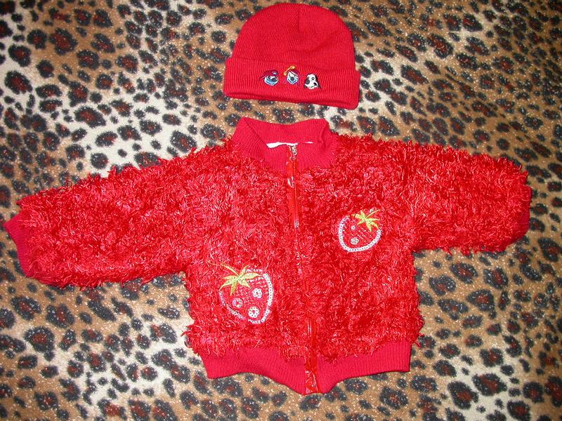 Куртка-кофта на 1-2,5 роки.На теплу весну-осінь.Стан відмінний. На фісе. Яскраве.Полунички це вишивка паєтками. Шапка нова в подарунок. Цена90грн