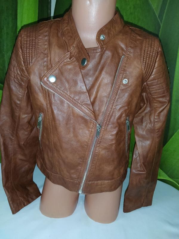 Крутая косуха очень красивого коричневого цвета темнее чем на фото !! ЭКО кожа !!! на 8-9лет ( длина 41 см, ПОГ 36см, рукав от горловины 55см, рукав от плеча 47см)