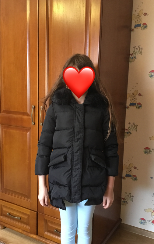 фабричний Китай. На замку і кнопках, у поясі можна звузити і розширити за рахунок кнопок по боках, в рукавах манжети, на капюшоні густе хутро і знімається. Гарний фасон, спереду коротша. Заявлено на ріст 120-150. На фото:дочка виросла з розміру курточки. Замеры по верху ПОГ- 41-42, рукав-48 длина спереди 59, по спине 65-66см