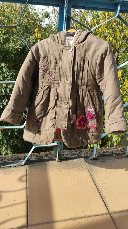 Чудова куртка, служила нам зміною минулої зими, хороший капюшон, застібається на блискавку і гудзики, яскрава підкладка.