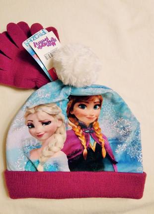 стильний набір для дівчинки ( шапка+ рукавички), приємний на дотик (як оксамит) верх з три - де малюнком з мультфільму" холодне серце" , всередині фліс, ширина шапочки-22( без розтяжки), висота до бубону-19,5 , рукавички довжина-13,5-14, розмір указан54
