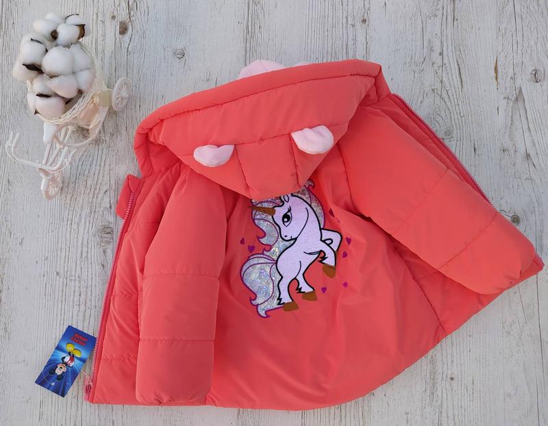 Курточка💣 "Єдиноріг" Розміри: 74.80.86.92.98 Склад:плащова тканина з бархатныйм напилення ,150 синтепон, підкладка на поличках, найніжніший микрофлис ніжно-сірого кольору, на спинці і в капюшоні! Малюнок і буковські вишиті!!! Колір: ніжний персик подовжена Спинка!! є бічні кишеньки!!! Капюшон не відстібається!!!.зеленяш