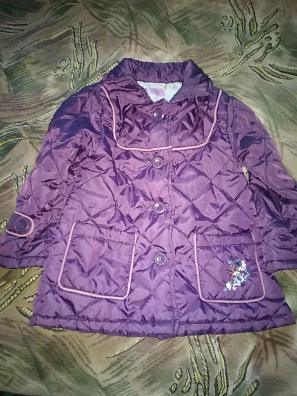 Куртка легенька,на тоненькій підкладці,є капішон розмір 92.Колір фіолетовий.Балонова.Довжина 43,рукав 33
