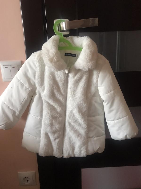 Білосніжка курточка для дівчинки на вік півтори-два роки. Дуже стильно виглядає. Подовжена (зараз дитині три роки то накриває їй попу, але рукава вже закороткі) Нова, куплена в в магазині Original Marines, етикетка знята, але дитина не носила, переросла в період карантину. По етикетці на вік 1 рік.