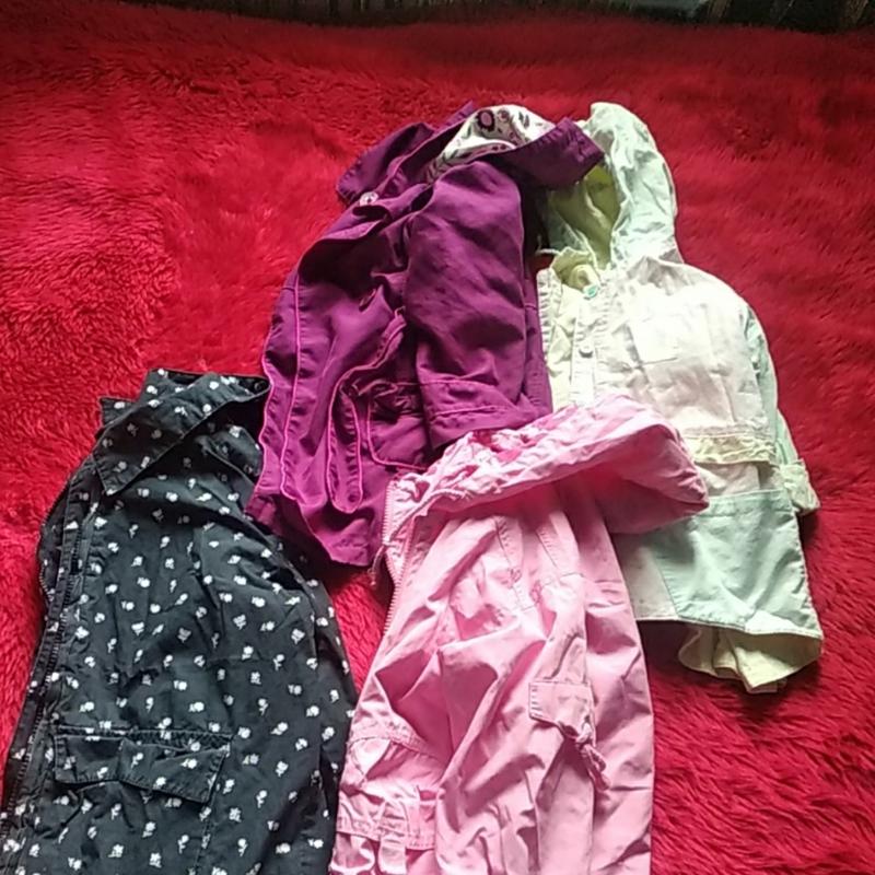 В ідеальному стані,в плащику не має одного гудзика,в синійвітровці на рукаві дірочка.Більше ніяких дифектів не має.Ціна за одиницю.Сіня(116),плащ(2-3роки), розова (110),світла дивіться по замірах